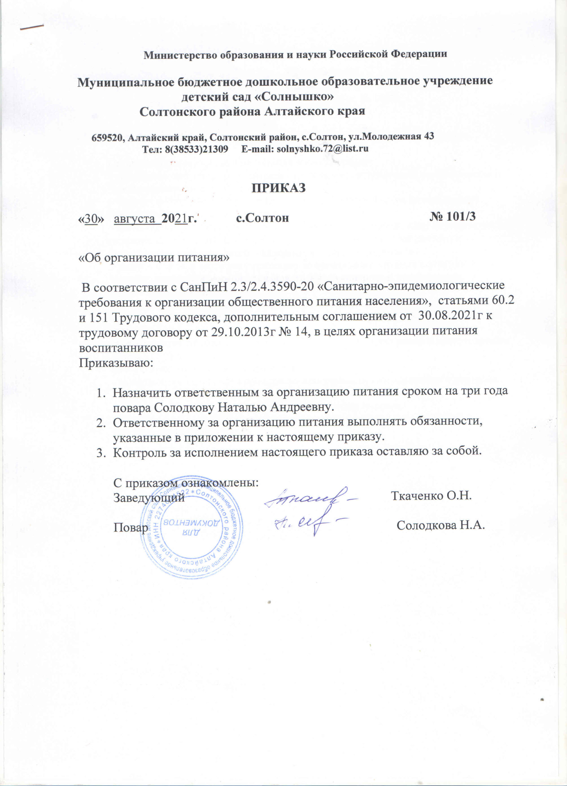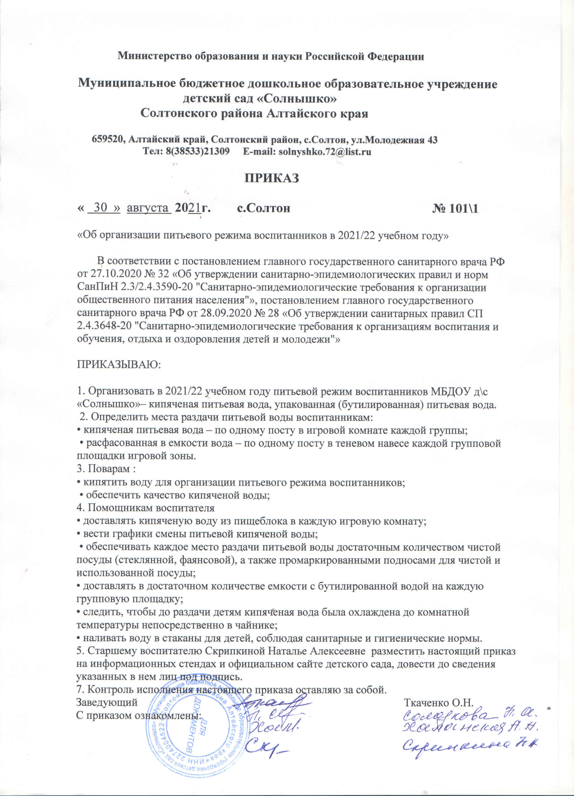 Приказ об организации питьевого режима в ДОУ